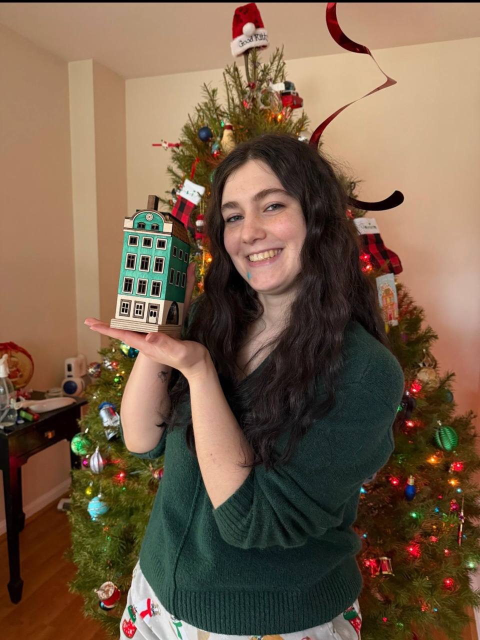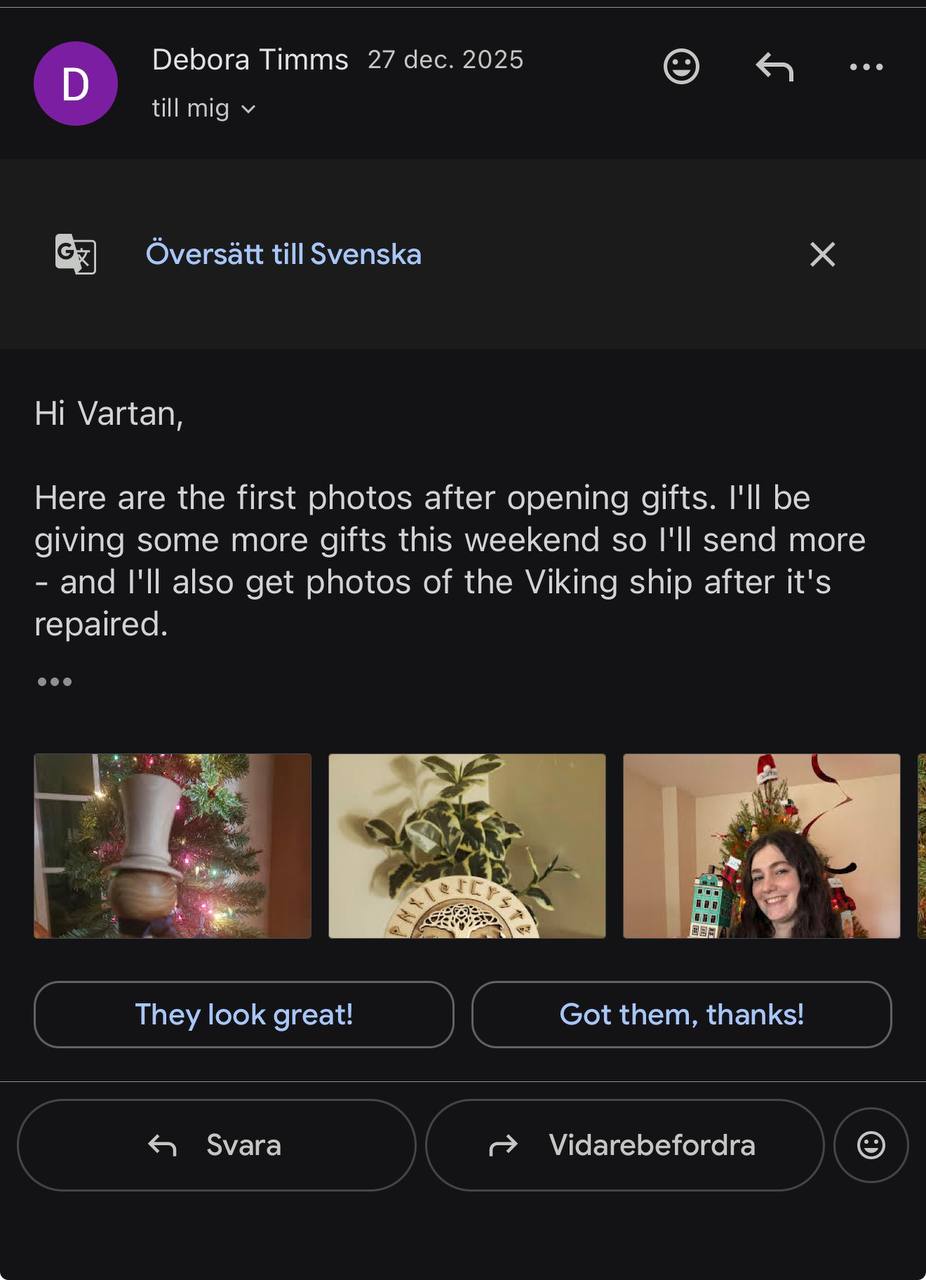 Here are the first photos after opening gifts. I’ll be giving some more gifts this weekend so I’ll send more – and I’ll also get photos of the Viking ship after it’s repaired.”